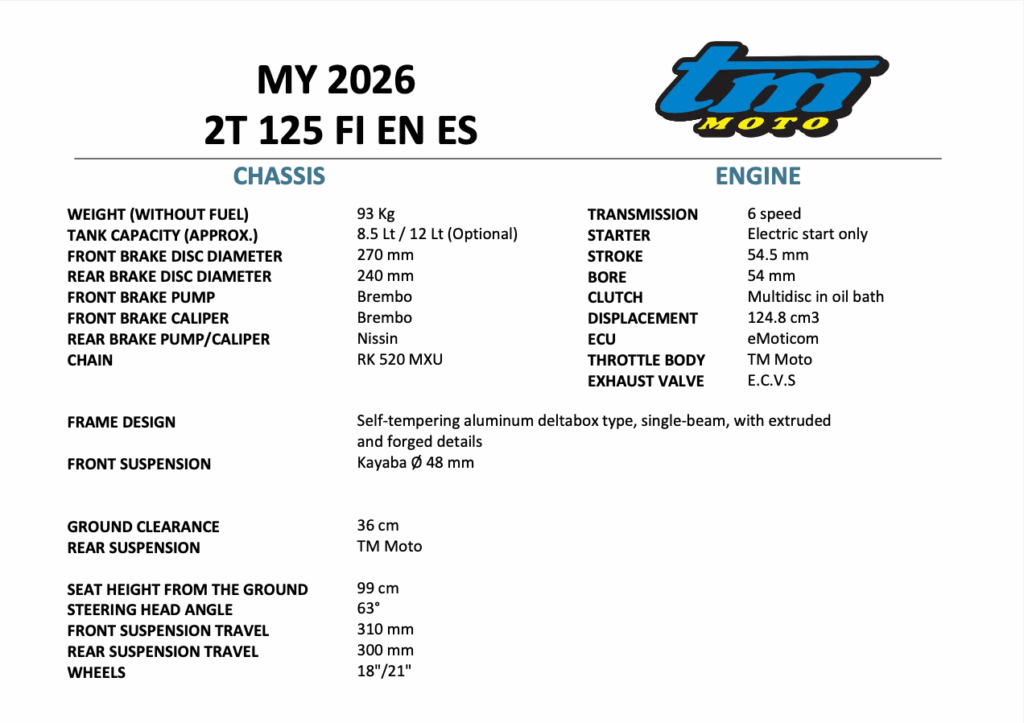 It is the result of many years of study and research, giving TM Racing a significant leadership. This bike is not only revolutionary as the first 125 cm³ Euro 5+ homologated injection motorcycle; like all the models, it results from a thorough revitalization in all aspects, both in design and components.